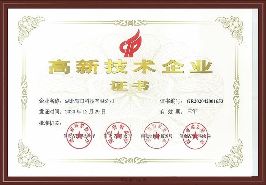 2020年12月29日,湖北窗口科技有限公司再次榮獲由湖北省科學(xué)技術(shù)廳、湖北省財(cái)政廳、湖北省國(guó)家稅務(wù)局、湖北省地方稅務(wù)局聯(lián)合頒發(fā)的《高新技術(shù)企業(yè)》證書(shū)。《高新技術(shù)企業(yè)》的成功獲批,是對(duì)公司實(shí)力的高度認(rèn)可,也是對(duì)公司引領(lǐng)行業(yè)前沿的持續(xù)鼓勵(lì)。